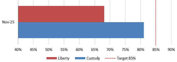 The graph shows the position at the end of November 2025 when 81.04% of cases where applicants in custody (in blue) and 68.10 % of cases where applicants were at liberty (in brown), were completed.