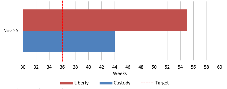The graph shows the position as at the end of November 2025, when the average time taken for a review of the case of an applicant in custody (in blue) was around 44 weeks. For cases involving applicants at liberty (in brown) it was around 55 weeks.