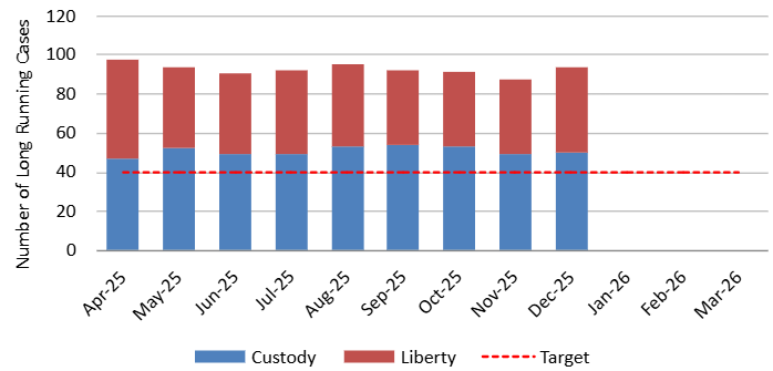 The graph shows the percentage of cases categorised as long running at the end of December 2025 and breaks them down by cases where the applicants are at liberty (shown in red) and in custody (shown in blue).