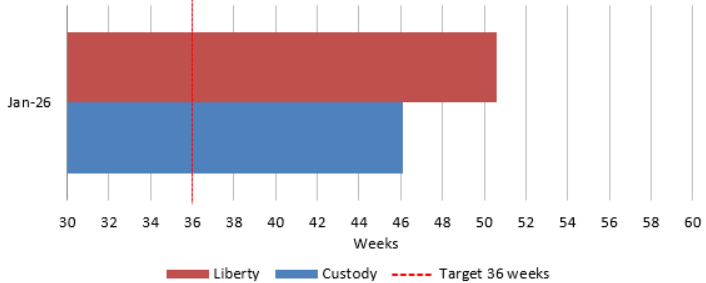 The graph shows the position as at the end of January 2026, when the average time taken for a review of the case of an applicant in custody (in blue) was around 46 weeks. For cases involving applicants at liberty (in brown) it was around 50 weeks.