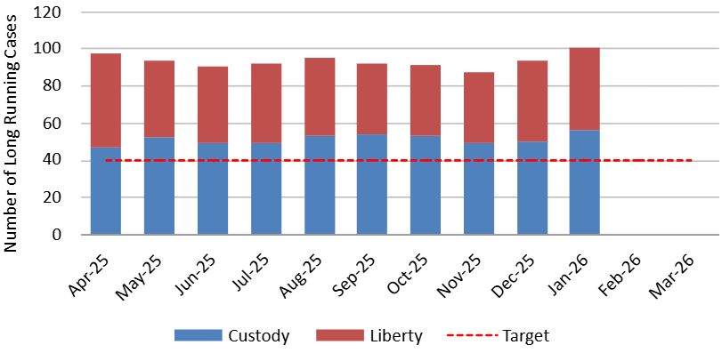 The graph shows the percentage of cases categorised as long running at the end of January 2026 and breaks them down by cases where the applicants are at liberty (shown in red) and in custody (shown in blue).